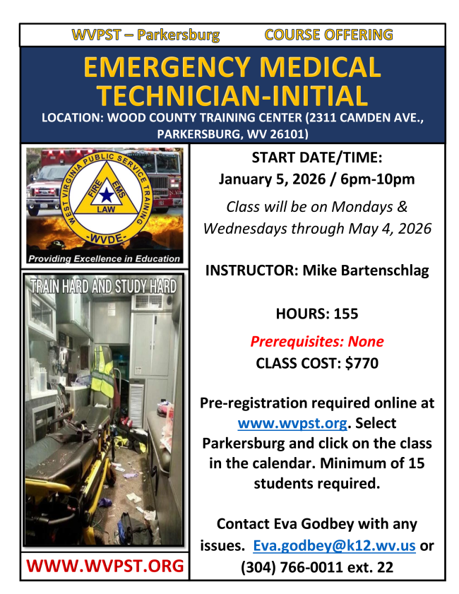 WV Public Service Training will be conducting an Emergency Medical Technician course beginning January 5, 2026 from 6:00 pm – 10:00 pm at the Wood County Training Center.