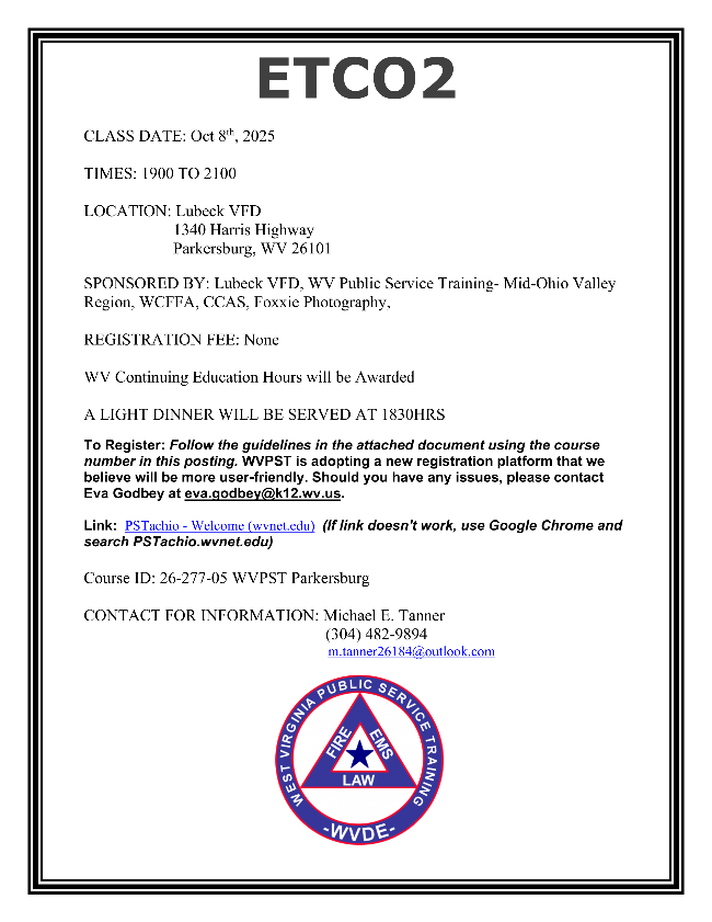 WVPST is pleased to announce an ETCO2 course at Lubeck VFD on October 8, 2025.