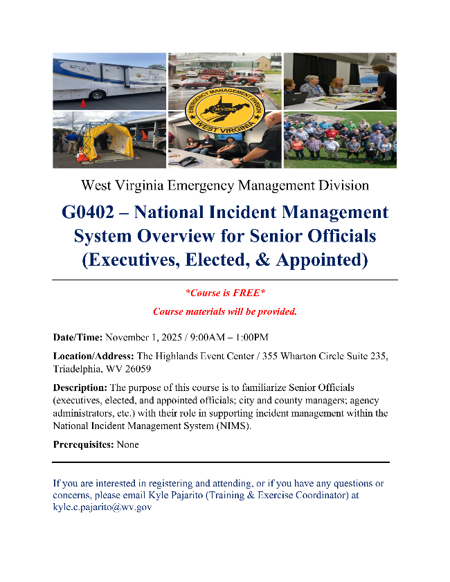 If you are interested in registering and attending, or if you have any questions or concerns, please email Kyle Pajarito (Training & Exercise Coordinator) at kyle.c.pajarito@wv.gov