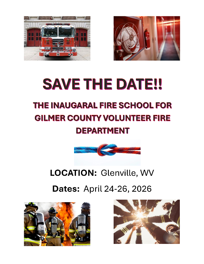 Save the date for the upcoming Inaugural Gilmer County VFD Fire School on April 24-26, 2026, in Glenville, WV.