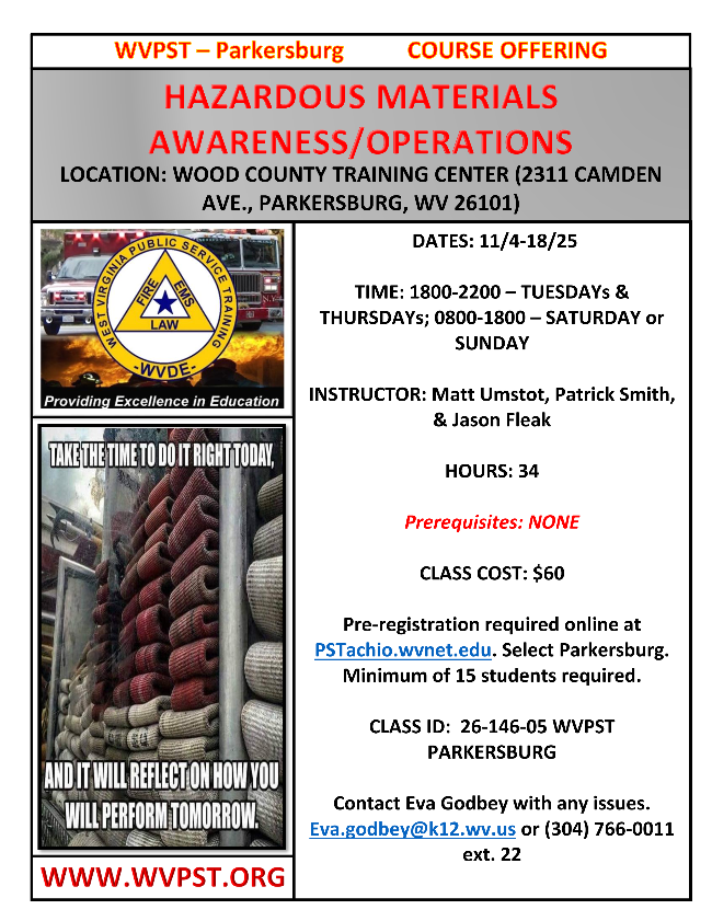 WVPST is pleased to announce a hazmat awareness/operations class.