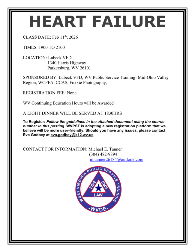 WVPST is pleased to announce a Heart Failure course at Lubeck VFD on February 11, 2026.