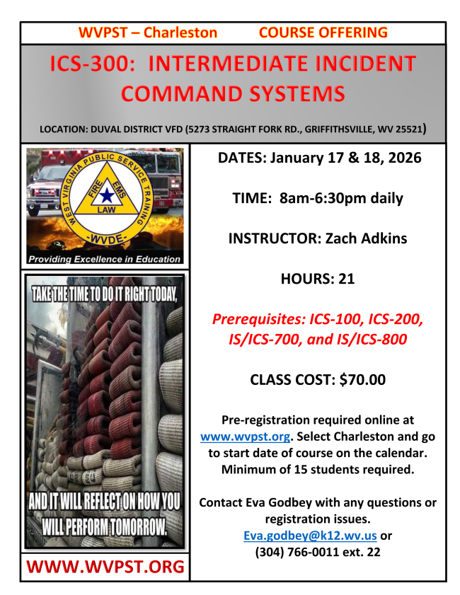 WV Public Service Training is pleased to announce an ICS: 300: Intermediate Incident Command System for Expanding Incidents on January 17 & 18, 2026 at Duval District VFD (5273 Straight Fork Rd., Griffithsville, WV 25521)